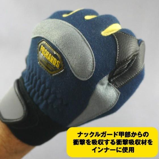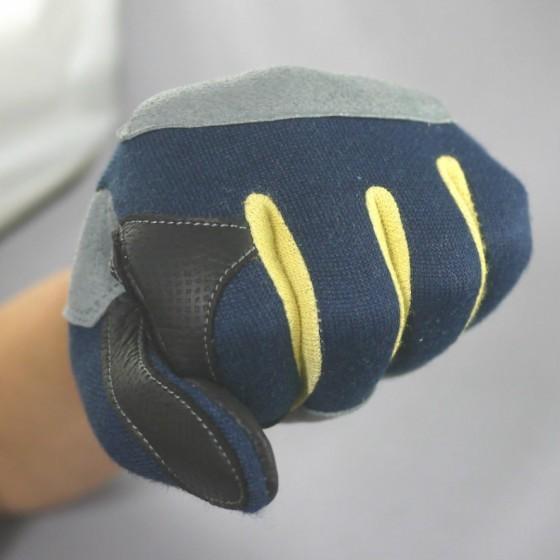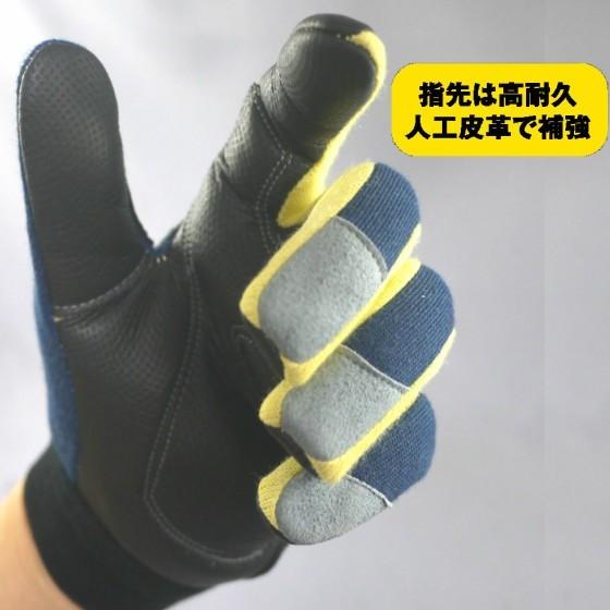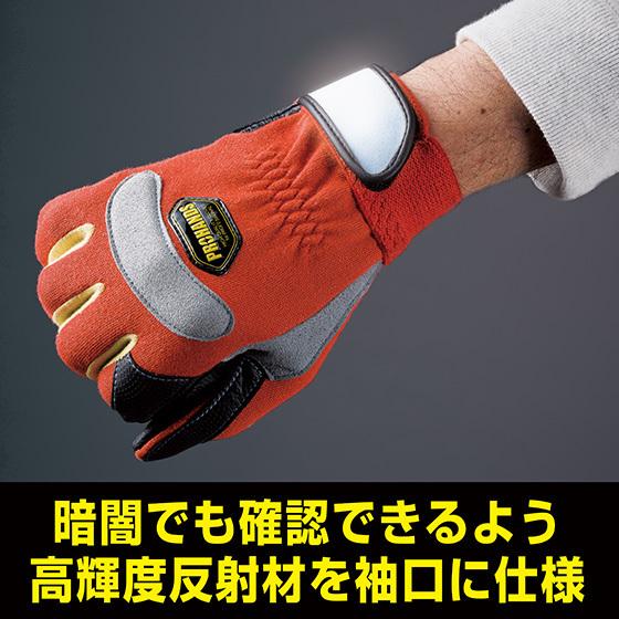 指先は高耐久人工皮革で補強し袖口は視認性の高い高輝度反射材を使用。
