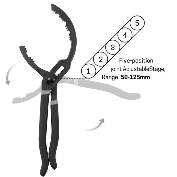 幅広いサイズに対応可能なプライヤー式オイルフィルターレンチです。特 徴プライヤーの内側にサメ歯のように返しがついているのでまわすほどに噛み付く構造となっています。50-12mm対応可能、5段階調節可能です。■商品仕様・対応サイズ:50〜120mm・全 長 : 350mm・重 量 : 600g