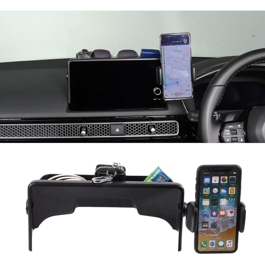 「2in1のスマホホルダー&収納トレイ」 この携帯ホルダーは、車載用の収納トレイとスマートフォンホルダーを一体化した2in1デザインです。