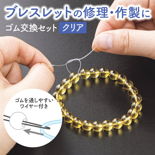 ブレスレットの修理・作製が自宅で簡単にできる透明なウレタンゴム。ゴムを通しやすいワイヤー、分かりやすいイラスト入りレシピ付き。
