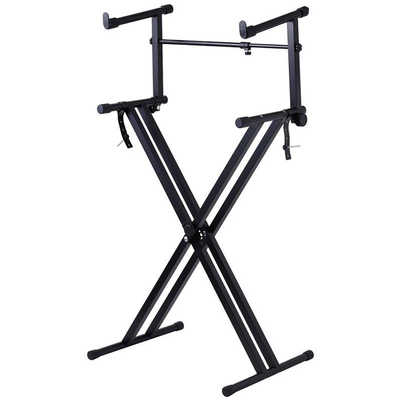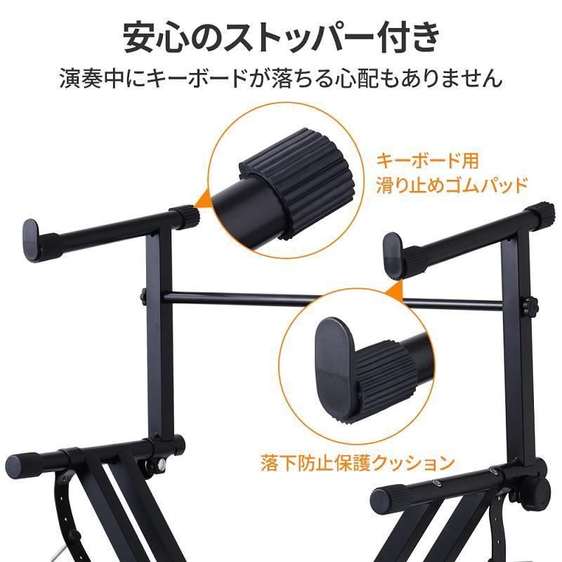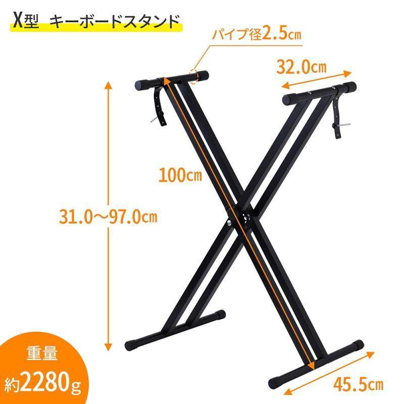 X型 キーボードスタンド 拡張アダプター付き<br><br>●キーボード2段セッティング可能<br>X型のキーボードスタンドに拡張アダプターを取り付ける事で、<br>メインキーボードを2台やサブキーボードの設置が可能。<br><br>●拡張アダプターの幅も自由自在!<br>幅が約37.5?69cmの間で調整可能。、<br>ご自身のキーボードに合わせてお使い頂けます。<br><br>●X型スタンドは7段階の高さ調整!<br>約31.0cm?97.0cmの間で調整可能。<br>演奏シーンに合わせて高さを調節して頂けます。<br><br>●折りたたんでスリムに収納<br>X型スタンドは折りたたみ可能。<br>幅約6cmの為、コンパクトに収納して頂けます。<br><br>【商品サイズ】<br>■拡張アダプター<br>・サイズ(約):幅37.5?69.0cmm(調整可)×高さ33.5cm×奥行31.0cm<br>・重量(約):900g<br>・材質:スチール<br><br>■X型スタンド<br>・サイズ(約):幅28.5cm?95.5cm×高さ31.0cm?97.0cm×奥行45.5cm<br>