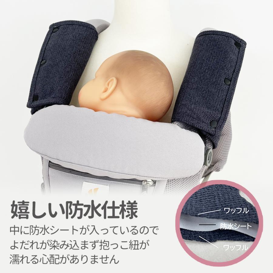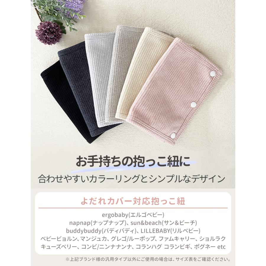 デリケートな赤ちゃんのお肌の為に作られた、やわらかな肌触りのよだれカバーです。肌を包み込むやさしいワッフル生地が赤ちゃんのお肌を守ります。プラスチック製のスナップボタンを3個使用しており、抱っこひもをよだれと汚れからしっかりカバーします。中に防水シートが入っているので、よだれが染み込みません。リバーシブルなので、汚れたら反対側にして使用できます。◇カラー:6色◇素材:綿50% ポリエステル50%◇サイズ:23cm×17cm