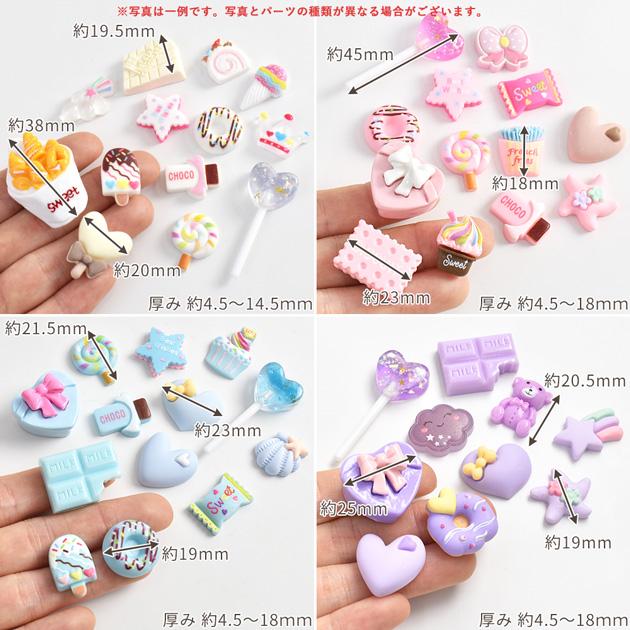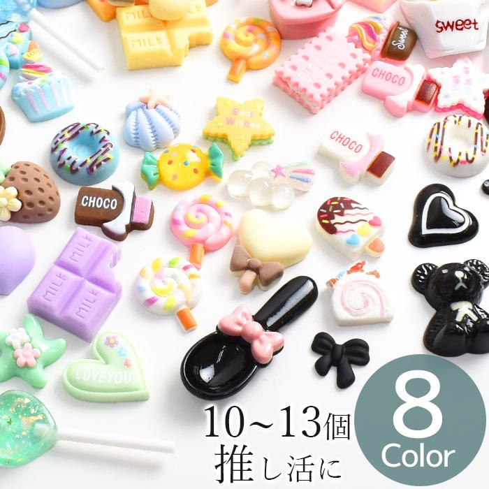 デコパーツ ミックス推しカラーセット10〜13個入り 全8色#ゆうパケ20点可あなたの推しカラーは何色?見ているだけでも気分が上がる可愛いパーツ小さめのものから存在感たっぷりの大きめのものまでデザインも大きさもいろいろ・・・なセットにしました。ホイップやビジュー、レーステープなど、他の素材と合わせて推し活デコレーションに◎グルーガンや接着剤で台座付きゴムやヘアピンに接着するだけでお子様のヘアアクセも簡単にできちゃいます。