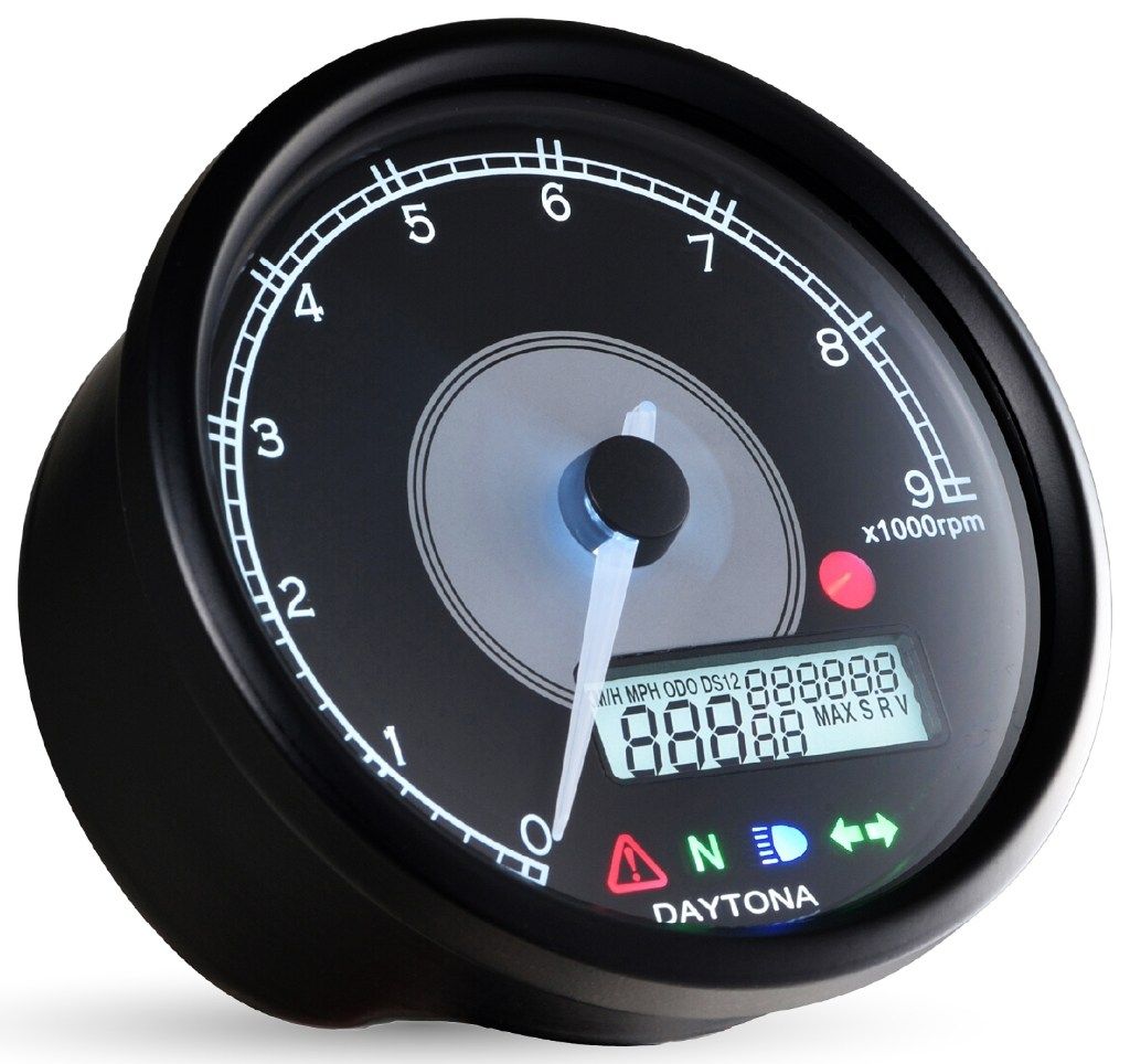 【クーポン配布中!】 デイトナ DAYTONA VELONA(ヴェローナ) バイク用 電気式 タコメーター 液晶スピードメーター付き インジケーター 電圧計 ブラックボディ/ホワイトLED φ80 9000rpm表示 48140