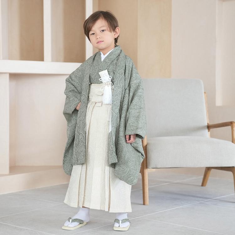 七五三 着物 5歳 男の子 購入 utatane レトロ ジャガードペイズリー くすみグリーン×オフホワイト 袴 五歳 五才 おしゃれ うたたね ウタタネ 販売 購入