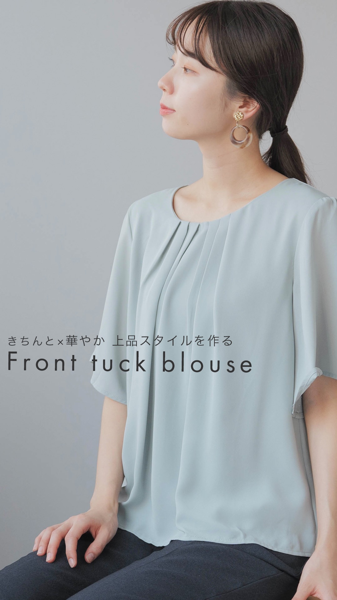 デイリーで使いやすい、工夫が詰まった上品なスタイルの五分袖のフロントタックブラウス