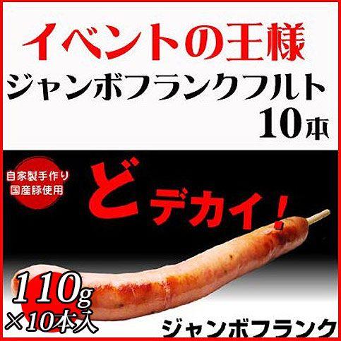 ■商 品 名 ジャンボフランク■内 容 量 110g×10本※羊腸を使っておりますので、羊腸の太さにより長さに差がございます。 1本約20cm前後となりますが、もっと短いものもありますし、長いものもあります。均一ではありません。ご了承の上お買い求め下さいませ。■賞味期限 製造後1年■保存方法 -18℃以下■配送方法 冷凍タイプ■お召し上がり方 お湯で温めて、後はホットプレートなどで 焼きあげるだけ縁日 イベント 学園際 お祭り 秋祭り 屋台 BBQ 国産 子供会 PTA