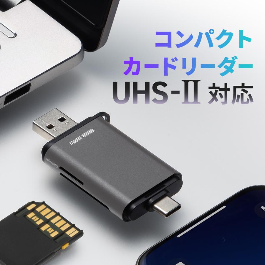 サンワダイレクト SDカードリーダー USB-A Type-C 接続 UHS-II 対応 2-in-1 SD microSD 同時認識 USB3.0 5Gdps 高速 SDXC/SDHC ガンメタリック 400-ADR338GM