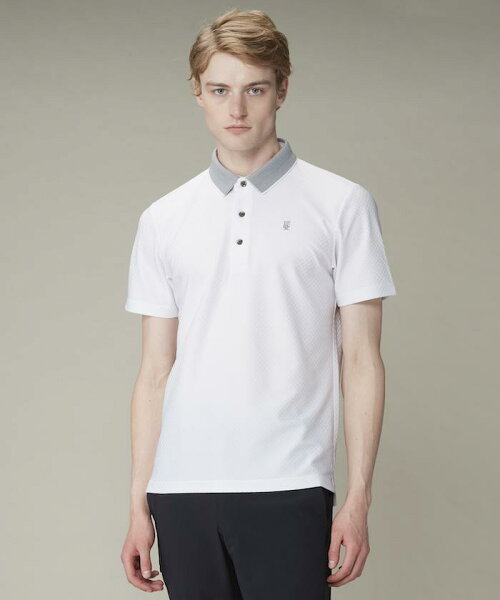 特殊な編み方のトリコット素材で菱形の幾何学柄モチーフの編地がモダンでスポーティな質感です。 縦横のストレッチ性にも優れた着心地の良い素材です。 デザインは衿、袖口にバーズアイ組織のリブを使用しています。