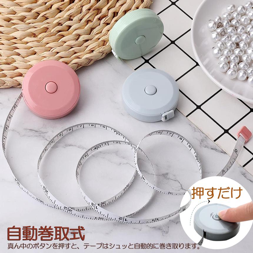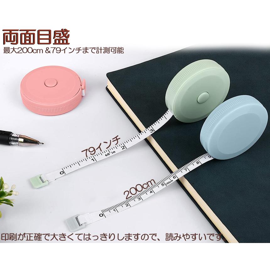 【自動巻取式・両面目盛】 この測定用巻尺は自動巻取式メジャーなので、真ん中の巻取りボタンを押すと、テープをシュッと自動的に巻き取ります。巻取りボタンを押したままでスムーズに引っ張り出し、引き出したところでボタンを離してからストップできます。裁縫用メジャーは測定単位が2つあり、片側にセンチメートルで、裏側にインチ単位で正確に印刷します。両面表記で、最大200cm(79inch)まで計測できます。