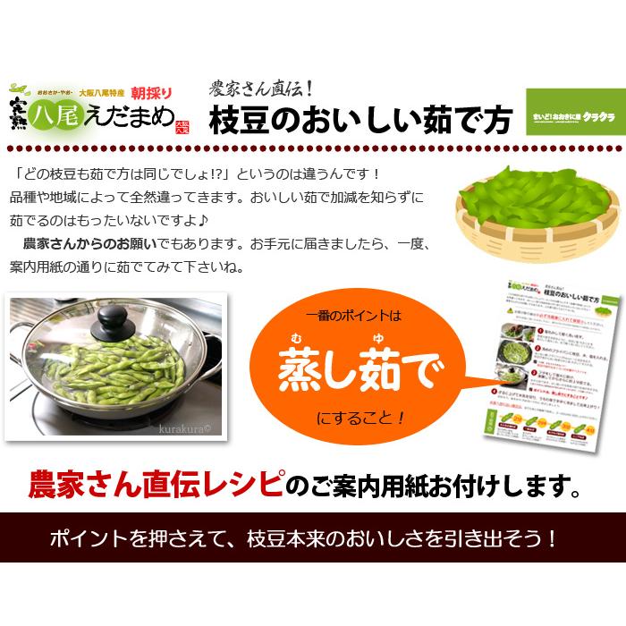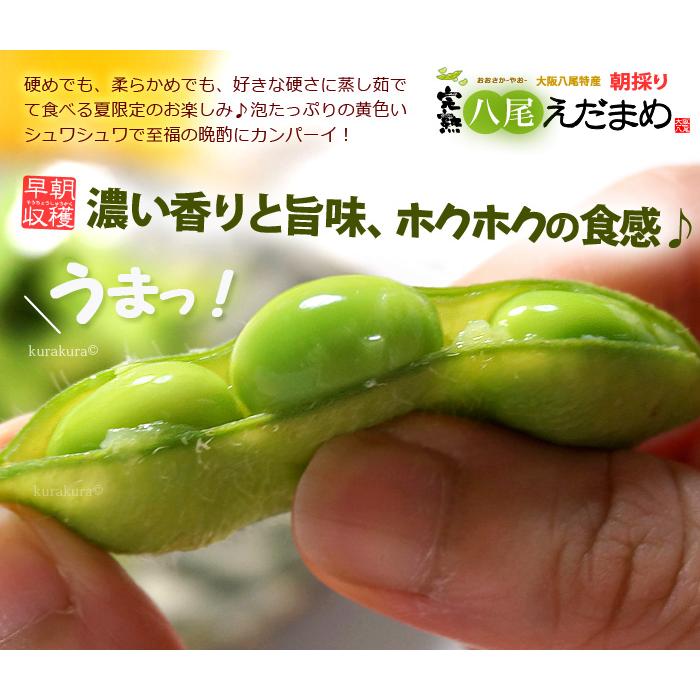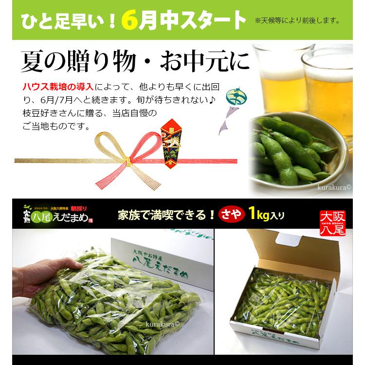商品名 : 八尾の枝豆(さや)内容量/産地 : 約1kg/大阪発送時期 : 6月下旬頃-7月下旬(指定日不可)発送形態 : ヤマト運輸 冷蔵便送料 : 送料込(北海道・沖縄・離島地域へのお届けは追加送料1,200円が必要)特記事項 : 期間中、週に1回程度の入荷となります。指定日はお受けすることができません。