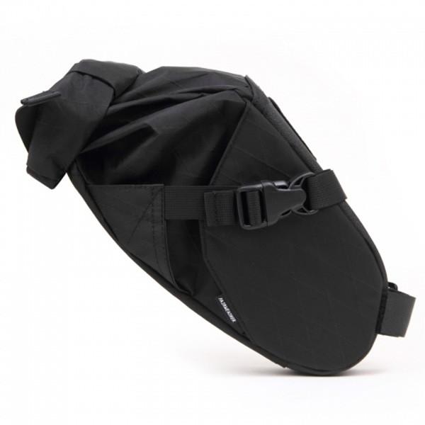 シートバッグよりも一回り小さなこのシートバッグミニはより身軽で機動性の高い装備を求める乗り手の声を形にして作られました。必要に応じて容量を調節できるロールトップ構造。コンパクトな見た目ですが、工具や携帯ポンプ、チューブなどに加え、輪行バッグやウィンドジャケットなどを余裕で収納することができます。ボディには軽量かつ高い耐久性と防水性を兼ね備えたX-PACナイロンを使用。表面には撥水加工、裏には防水フィルムがラミネートされており、雨天での使用も考慮された作りになっています。ほどよいサイズ感とホールド性の高い構造から大きなサドルバッグの欠点といわれるダンシング時のバッグの揺れを感じにくい。