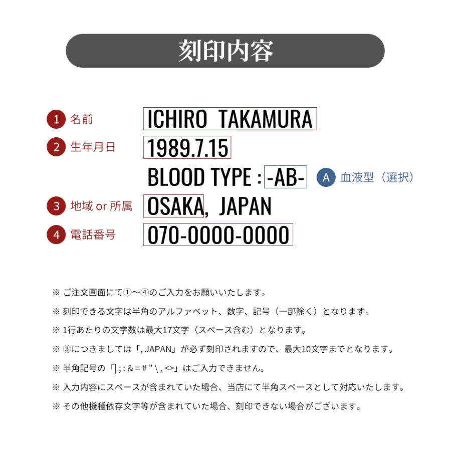 【刻印無料】お名前、生年月日、血液型、地域/所属、電話番号を無料で刻印いたします。