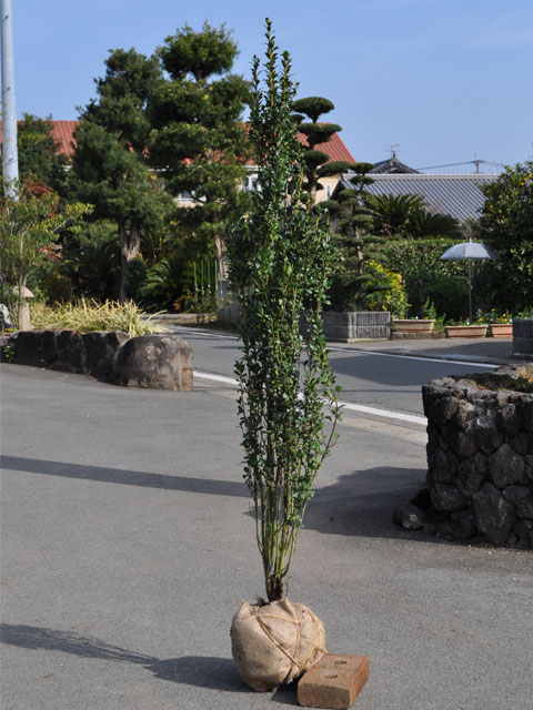 【スカイペンシル】 読み:すかいぺんしる 学名:Ilex crenata 'SkyPencil' モチノキ科モチノキ属 常緑低木 【商品情報】 スカイペンシルはモチノキ科のイヌツゲの仲間です。枝がすべて上を向いて伸びますので樹形が引き締まっています。葉はイヌツゲと同じ小さく光沢がある葉です。一年中葉が落ちません。あまり伸びず、枝が暴れたりしませんので剪定の必要がありません。非常に手間が掛からない品種です。初夏に小さい白い花を咲かせ黒い小さい実がなります。日陰にもよく耐えますので植える場所を選びません。