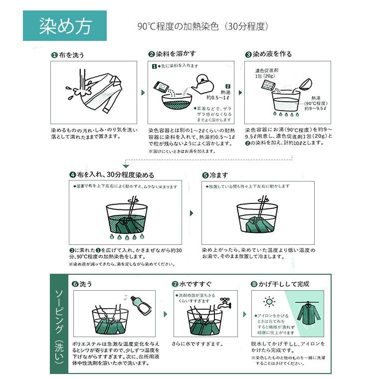 お湯約9〜9.5Lに対し、染料と濃色促進剤を入れ加熱染色するだけでポリエステル100%繊維の染色が楽しめます。(加熱ソーピング不要)