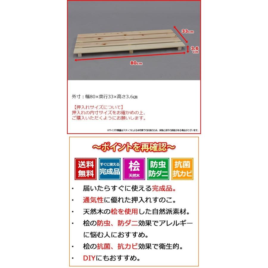 『国産桧 押入れ すのこ』(6枚セット) 幅80cm 奥行き33cm 高さ3.6cm 送料無料 日本製ひのきを使用したシンプルなスノコ(桧すのこ ひのきスノコ 檜すのこ ヒノキすのこ)天然木すのこ板(スノコ板) 押し入れ収納 湿気対策 梅雨対策 防虫 防カビ 抗菌 抗カビ ナチュラル 完成品