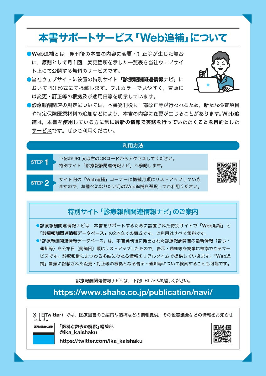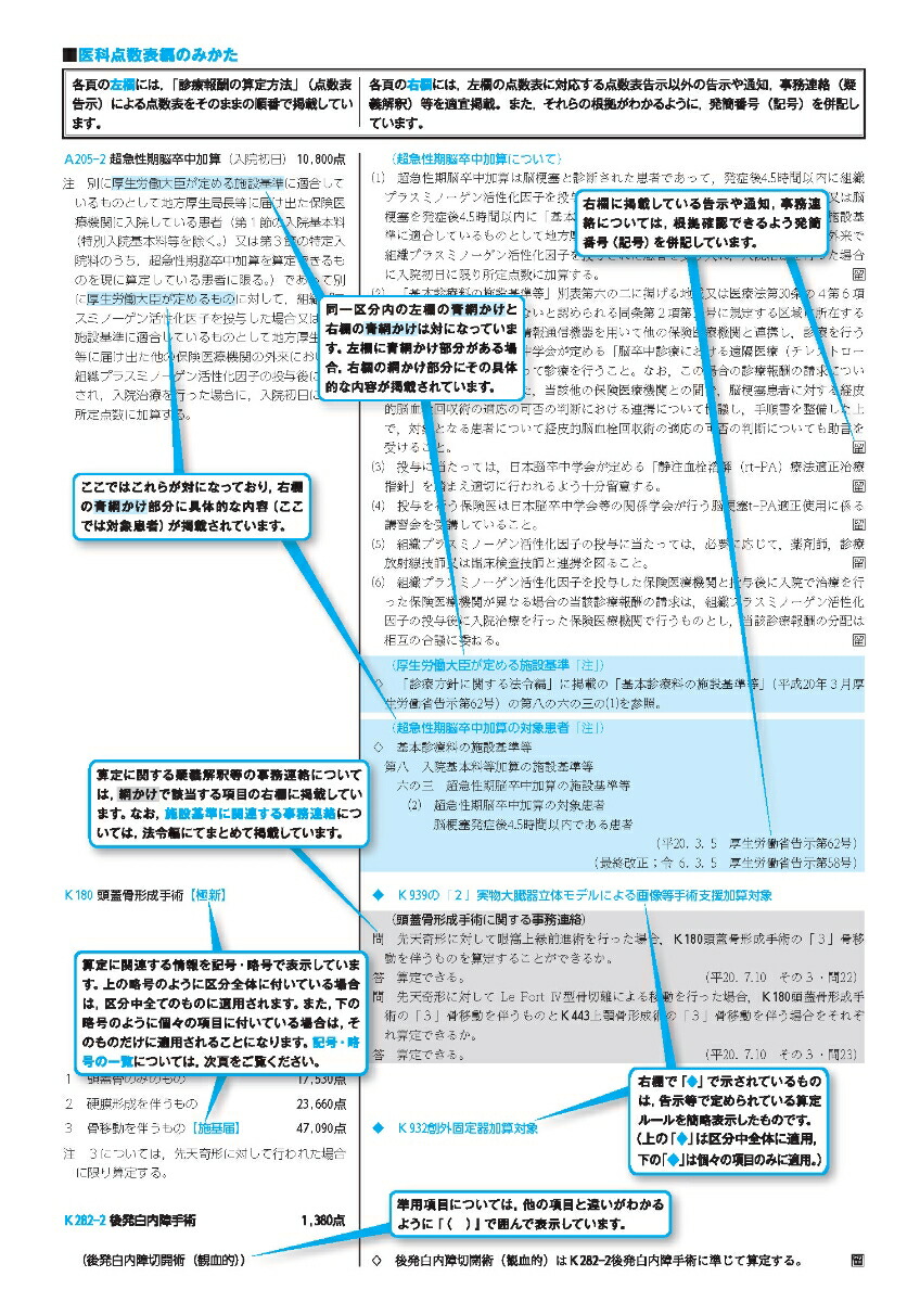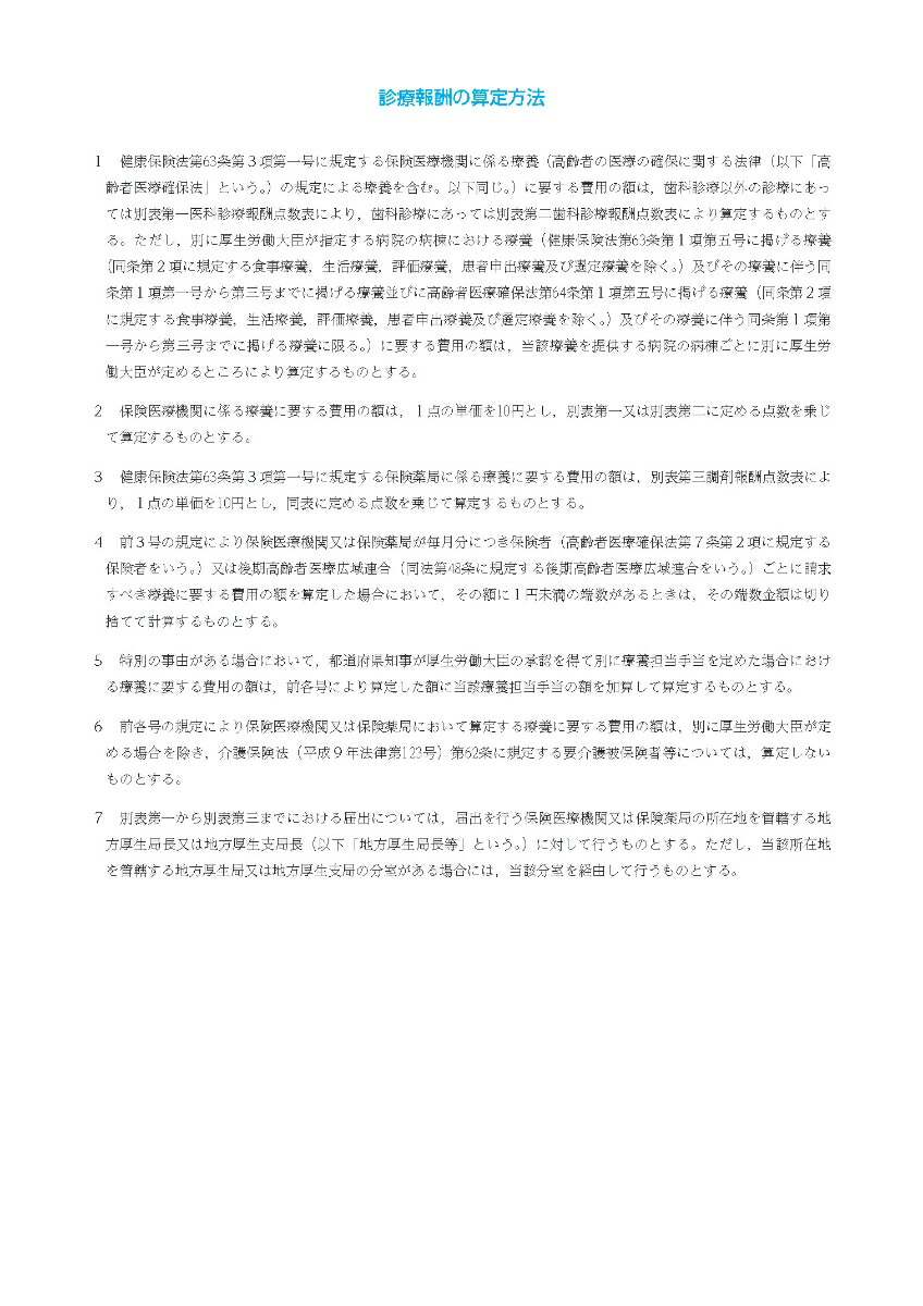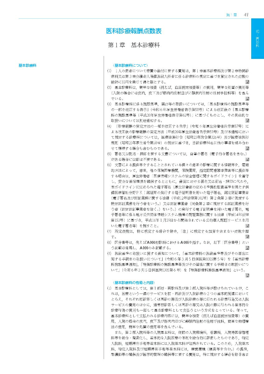 絶大なる信頼を得た点数表書籍の決定版『必要な情報を体系的に網羅し,抜群の正確さを誇る決定版』◆本書は,類書中,群を抜く正確さにより,各審査機関にも長年使用されている医療関係者必携の書となっています。◆診療報酬請求事務を始めて間もない方はもちろん,ワンランク上の医療事務者として活躍したい方には必要不可欠な書籍です。◆診療報酬明細書の「摘要」欄への記載事項も,診療行為ごとに表示しました。「本書を使用する方の視点に立ち,より理解しやすい配色を目指しています」●色をつけた部分には相応の意味をもたせ,視覚的に理解できるようになっています。●同一区分内の左欄と右欄の青色の網かけは対(つい)になっており,どこを見ればいいのかひと目でわかります。「小さな工夫を積み重ねながら,「使いやすさ」を追求」●区分番号レベルまで表示した目次や,詳細な50音索引で知りたい項目を素早く検索できます。●施設基準や別紙様式では対応する区分番号を表示し,項目の検索が便利になっています。●法令編では告示部分と通知部分が容易に区別できるように,別々のフォントを使用しています。「内容変更等があっても安心。「Web追補」でしっかりと対応します!」●診療報酬関連の規定は,本書発刊後も毎月のように一部改正等が行われます。保険診療が可能な検査項目の追加など,実務において重要な変更がなされることもしばしばあります。●「Web追補」は,常に最新の情報で実務を行っていただくためのもので,発刊後の本書の内容に変更・訂正等が生じた場合に,原則として月1回,当社ウェブサイト上に掲載します。この追補を毎月確認していただくことで,常に正確な実務を行うことができます。●「Web追補」は,当社ウェブサイトに設置された特別サイト「診療報酬関連情報ナビ」においてPDF形式にて掲載します。ファイルをダウンロードしていただき日々の実務にご活用ください。「その他にも「絶対使える!」コンテンツを用意しています。」●「診療報酬関連情報ナビ」には,本書発刊以後に発出された,診療報酬関連の最新情報(告示・通知等)を公布日(発簡日)順にリストアップしていく「診療報酬関連情報」コーナーも設置しています。診療報酬にまつわる多岐にわたる情報をリアルタイムで提供していきます。●当社編集部によるX(旧Twitter)では,医療や診療報酬にまつわる時事ネタや本書に関する興味深い情報を発信中。こちらもぜひご利用ください。ウェブコンテンツ特設サイトのご案内〇従来、本書に掲載していたコンテンツのうち、データでの提供が有用なものについては、特設サイトに掲載しています。〇施設基準(基本・特掲)の届出様式については、様式番号順・診療行為順に整理して掲載し、キーワード検索も可能です。本書の構成■医科点数表編医科診療報酬点数表別紙様式特定保険医療材料に関する告示・通知入院時食事療養及び入院時生活療養に関する告示・通知■診療方針に関する法令編1療養担当規則関係2基本診療料関係3特掲診療料関係4医療保険と介護保険の給付調整■索引医科点数表の解釈(令和6年6月版)医科診療報酬点数表(令和6年6月版)定価 (税込)6,820円3,300円おすすめな人初心者からベテランまで全ての方・QAや法令を含めた詳細な情報が欲しい方・より高いレベルの知識を身につけたい方初めて点数表を使う方・医療事務の学習用に使用する方QA(疑義解釈)の掲載ありなし早見表の掲載なしあり収載する情報必要な情報を体系的に網羅算定に必要な情報を見やすく収載更新日:2025年10月02日