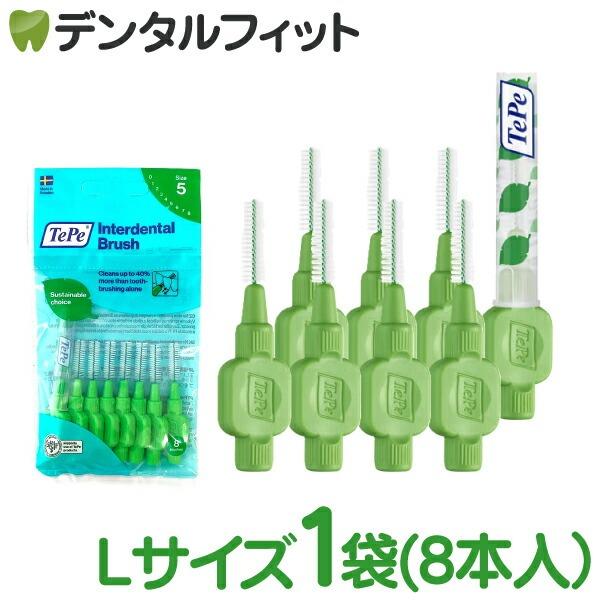 Tepeの歯間ブラシ。付属のキャップは、ブラシを守ることはもちろん、後部に付けることで持ち手としてもご使用いただけます。【サイズ】L(最少通過径:1.5〜1.8mm)【ワイヤ径】0.8mm【カラー】グリーン【ブラシ部長さ】18.0mm【製造国】Sweden【内容】8本(キャップ1個)