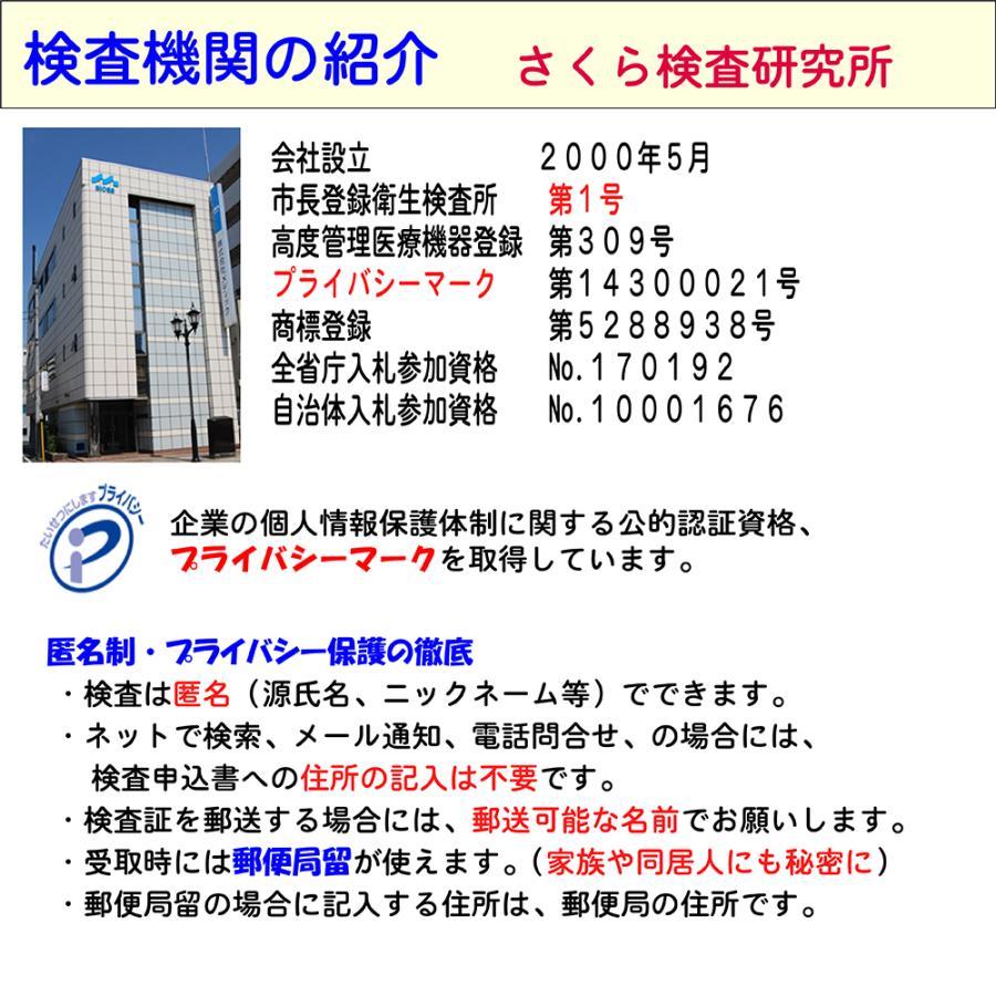 ■ 検査内容:エイズ 梅毒 淋菌 トリコモナス カンジダ クラミジア■ 検査結果の通知方法は、検体返送時の「検査申込書」で指定します。・インターネットで検索・メールで受信・普通郵便で「検査証」を受領・郵便局留で「検査証」を受領・電話問合せが指定できます。(複数指定も可能)指定方法の詳細 URL(弊社サイト)は、https://www.medic-jp.com/m3write.html「受注確認メール」にも記載しています。