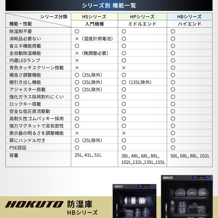 操作&設置が簡単、管理が楽になります:HOKUTOの防湿庫はコンセントに通電するだけで面倒な乾燥剤の交換不要です。気密性の高いキャビネットが日常生活で発生するホコリを軽減し、機械が常に安定した湿度を保ちます。ほんの少し排熱がありますので、背面及び側面部に、3cm以上の隙間を開けて設置ください。(100V 50/60Hz・日本国内屋内仕様 国内規格の電気安全法(通称PSE)取得しております)