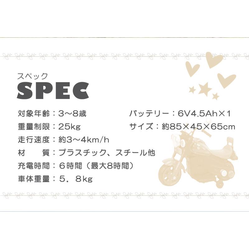 ■商品サイズ:(約)全長85cmx幅44cmx高さ65cm■ハンドル高:(約)51.5cm■シート高:(約)32cm■梱包サイズ:(約)全長62cmx幅36cmx高さ40cm■車体重量:(約)5.8kg■対象年齢:3〜8歳■体重制限:(約)25kg■乗車人数:1人■バッテリー:6V4.5Ah■モーター:後輪シングルモーター■付属品:取扱説明書、家庭用6V充電器■充電器:電気用品安全法(PSEマーク)認定品