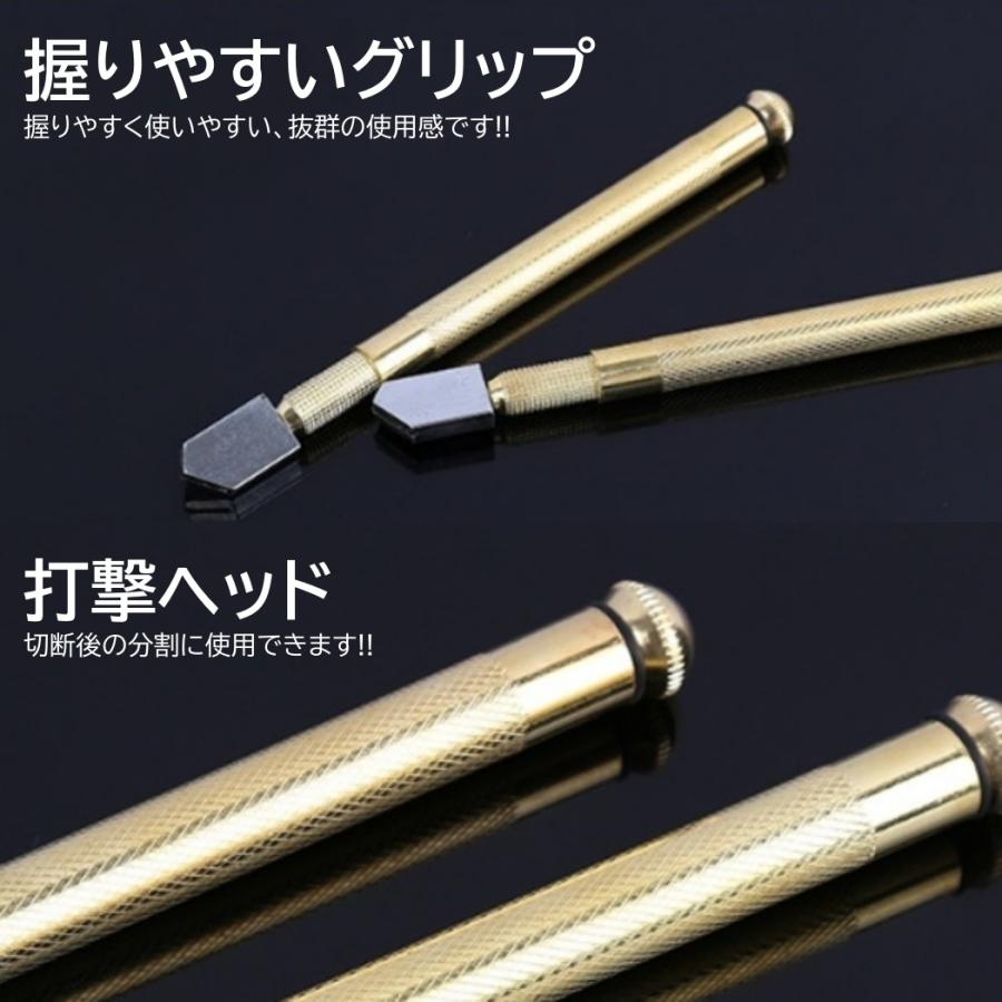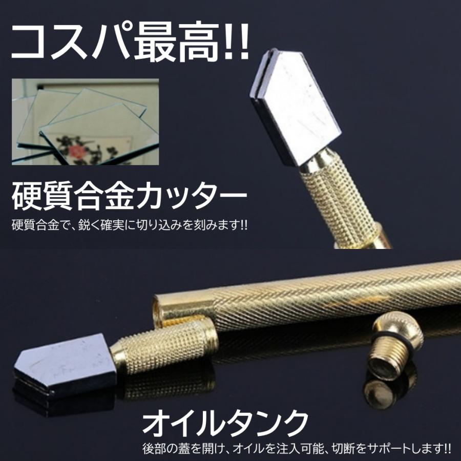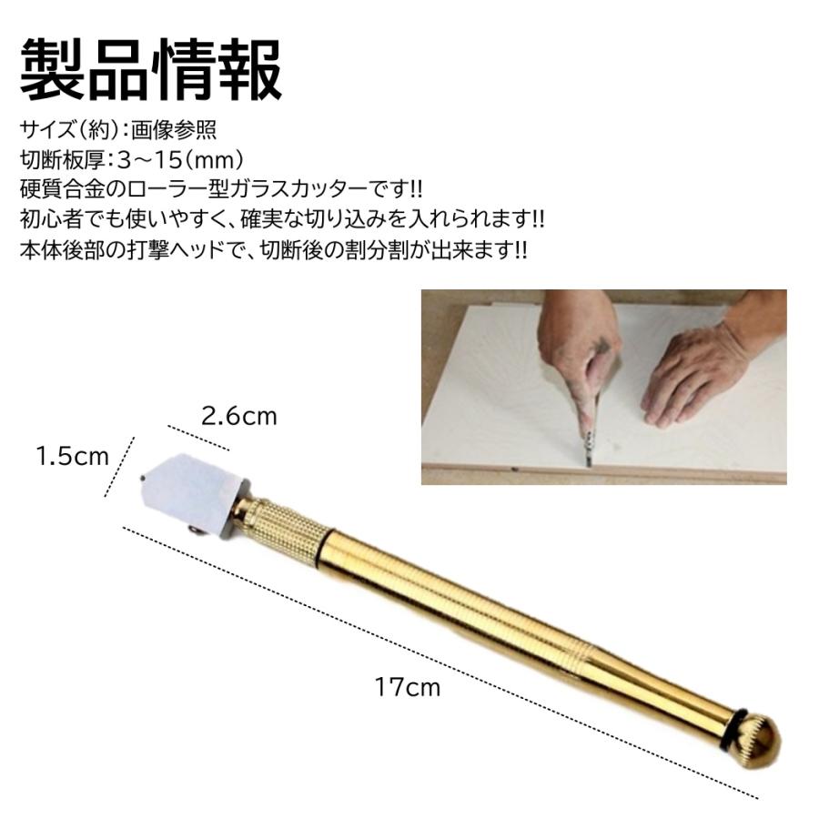 ■商品概要・ガラス、タイル、ミラー等にも使える高強度のガラスカッターです!!・ヘッドはローラータイプを採用、カットに便利で初心者から熟練者まで幅広くお使いいただけます!!・カッター後部の球体部分を外してオイルを注ぐと、使用時に刃部に流れカットをさらに快適に出来ます!!・全国一律送料無料となります!!■商品仕様【入数】:1本【材質】:硬質合金【サイズ】:画像参照【切断可能板厚】:3-15mm