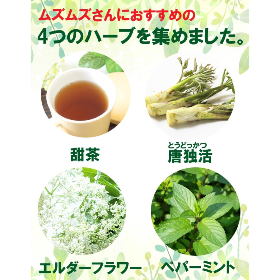 ムズムズが気になる方におすすめのハーブティーです。甜茶ポリフェノールたっぷりのバラ科の甜茶や唐独活などをブレンドしました。<原材料>甜茶(中国)、唐独活、エルダーフラワー、ペパーミント<原産国>日本<内容量>ティーバッグ30包(1包1.4g) 賞味期限:出荷から365日以上のものをお届け商品名 ムズムズさんのハーブティー20包 ティーバッグ 甜茶 唐独活 エルダーフラワー ペパーミント 花粉対策 アレルギー対策 ノンカフェイン ブレンド茶