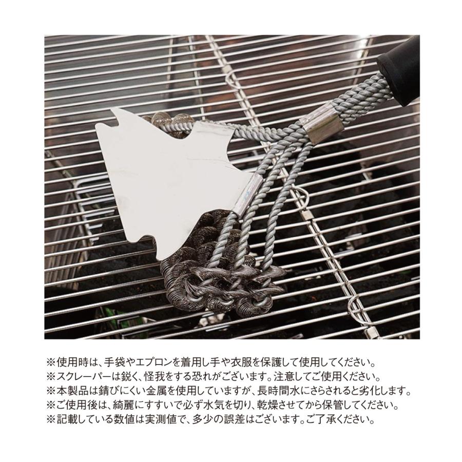 バーベキュー グリルブラシ【頑固な汚れに】網の間にこびりついた頑固な汚れを束になった3本のブラシが剥がし落とします。【スプリング状ブラシで】3つの重なったスプリング状のブラシが網の汚れを落とします。【スクレーバー】平らなところで使いやすいスクレーバーも装備され、快適に削り落とすことができます。【役立つスクレーバー】スクレーバーがあると、ブラシで取れにくい所や平らにするのに役立ちます。また、網に合わせた切込みが回り込んだ汚れ落としに最適です。