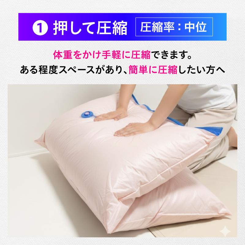 掃除機・付属ポンプ・手押しの3通りに対応した布団圧縮袋です。