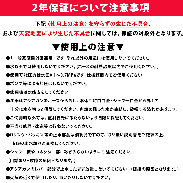 握った分だけ水が出る水量調整アクアガンと、耐圧糸入り・防藻機能付きホースを採用しています。