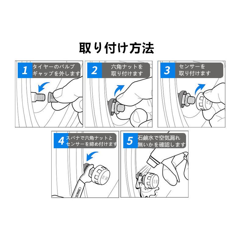 【取り付け簡単】本体を充電した後電源を入れ、センサー4つをタイヤにつけるだけで完了!無線式+ソーラー充電でわずらわしい配線作業は一切ありません。