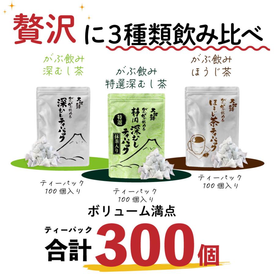 内容:特選がぶ飲み深むしティーパック(2.5g×100包入)×1袋、がぶ飲み深むしティーパック250g(2.5g×100個入り)×1袋、がぶ飲みほうじ茶ティーパック150g(1.5g×100個入り)×1袋