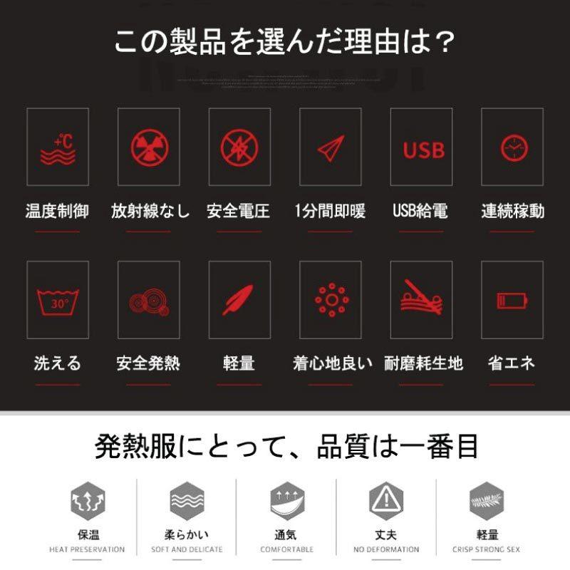 ※電熱ベストは水洗い出来るが、力強く揉まないで下さい、加熱電路を損害する可能性があります。自然乾燥してください;洗濯機で洗う前に、洗濯袋に入れてください;洗濯前に必ずモバイルバッテリーを外してください。