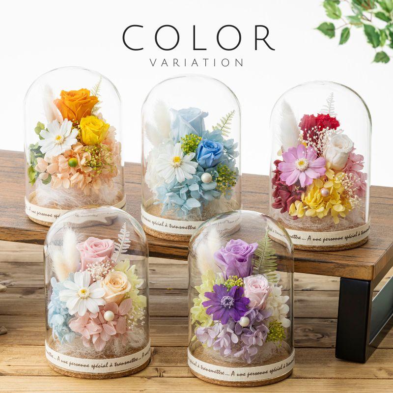 森をイメージしたカラフルなお花をグラスドームいっぱいにアレンジしました