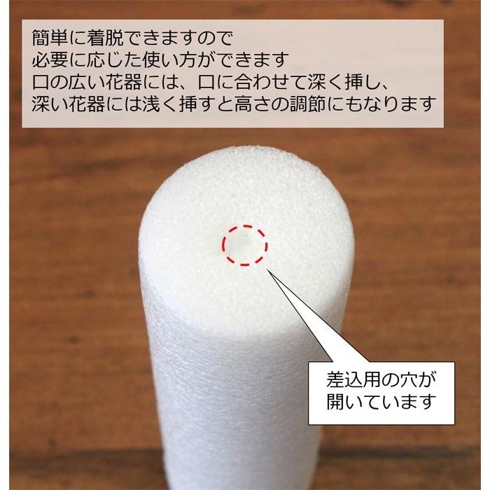 国内でひとつひとつ、葉のふくらみを確認しながら、手で組んで作っています。お榊を花器に入れた時の見栄えにこだわり、花器固定用の円筒型スポンジをお付けしています。