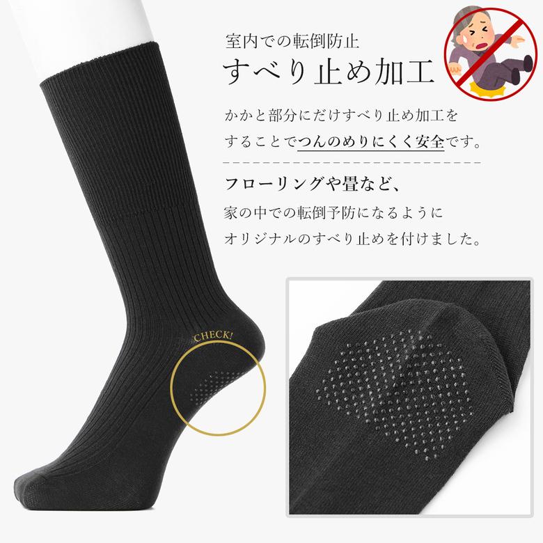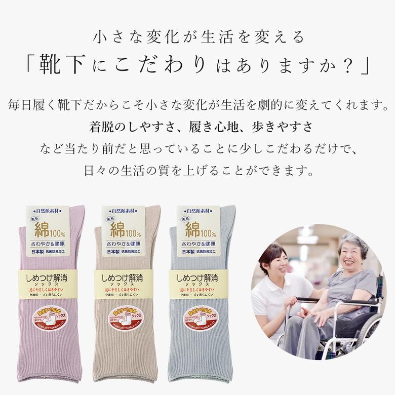 足がむくむ方や、姿勢の制限で履きにくい方、ゴムのあたりにかゆみのでる方などに最適な介護用の靴下です。