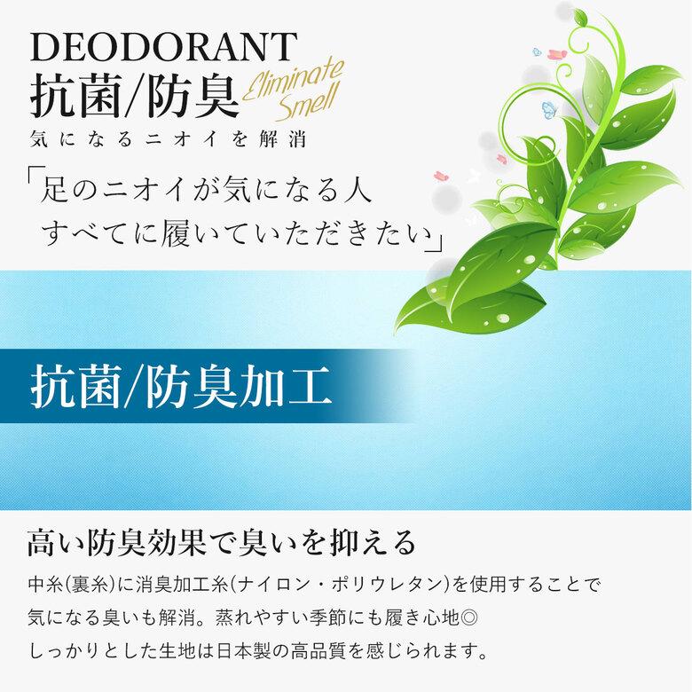 中糸(裏糸)に消臭加工糸(ナイロン・ポリウレタン)を使用することで気になる臭いも解消。蒸れやすい季節にも履き心地◎