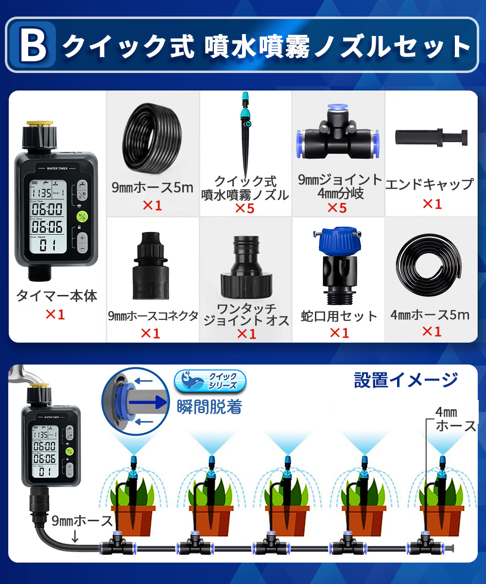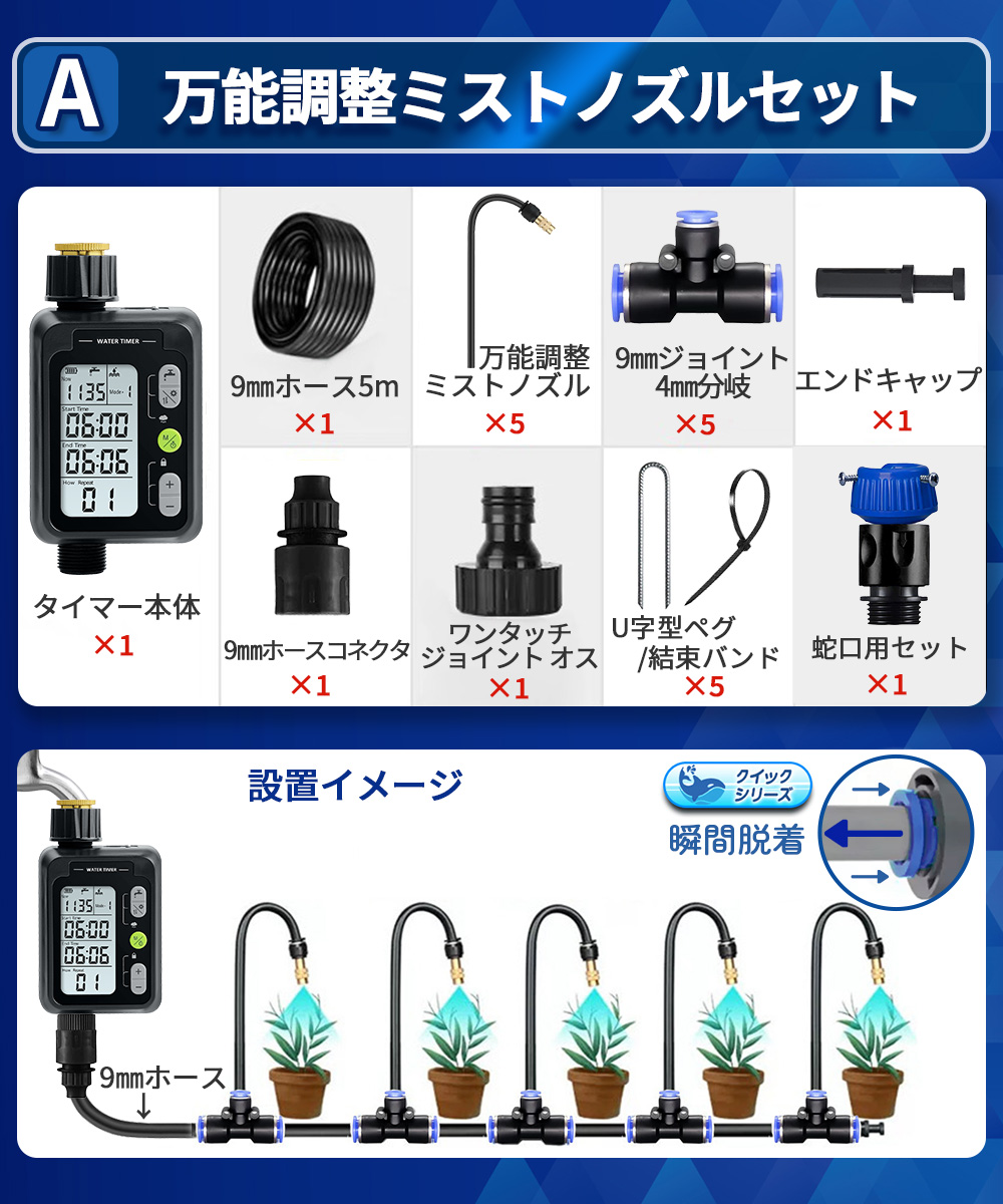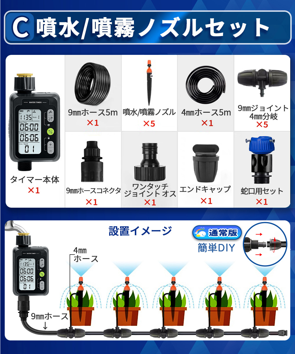 ・散水ノズルを4種類(万能調整ミストノズル、クイック式噴水噴霧ノズル、噴水噴霧ノズル、水量調節点滴ノズル)からお選びいただき、ご購入ください。
