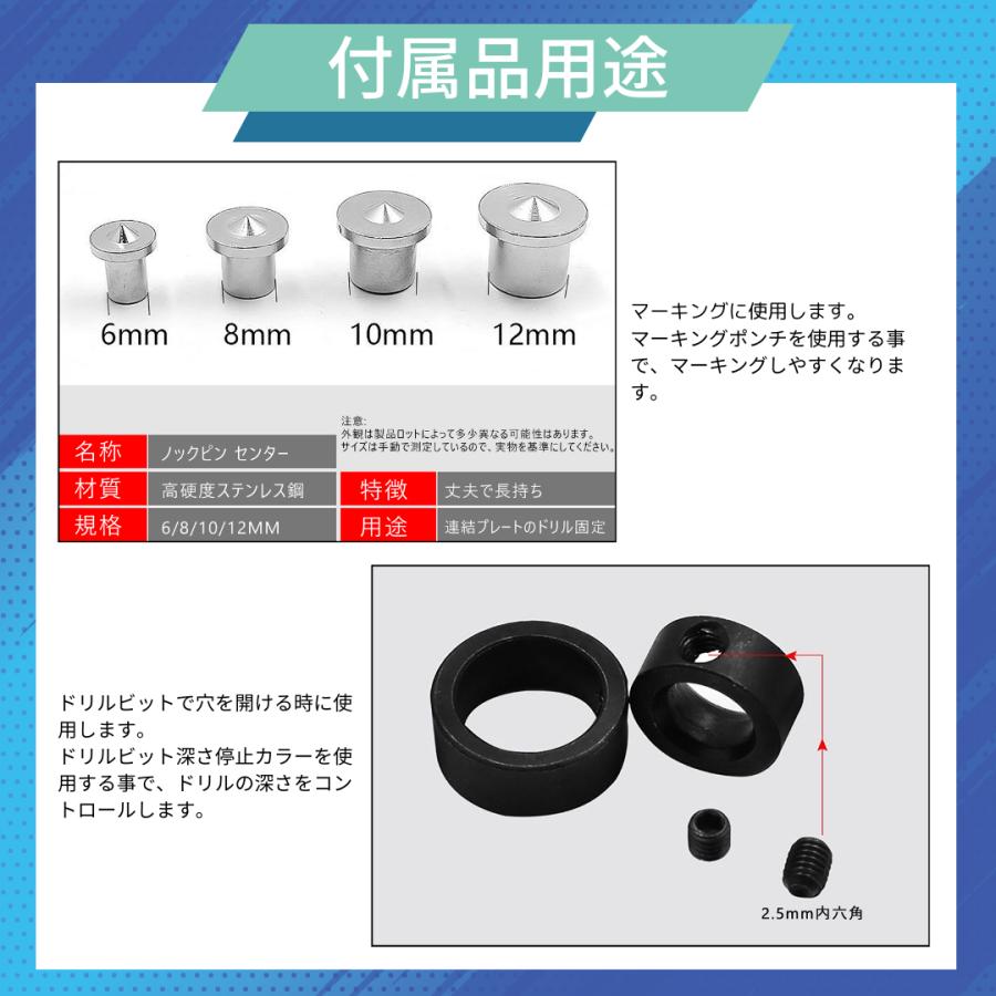 ・内容物:木工用ダボ6mm、8mm、10mmの各10本、ドリルビット6mm、8mm、10mmの各1本、マーキングポンチ6mm、8mm、10mm、12mmの各1個、ドリルビットの深さ止めカラー6mm、8mm、10mmの各1個、レンチ1本が含まれています。