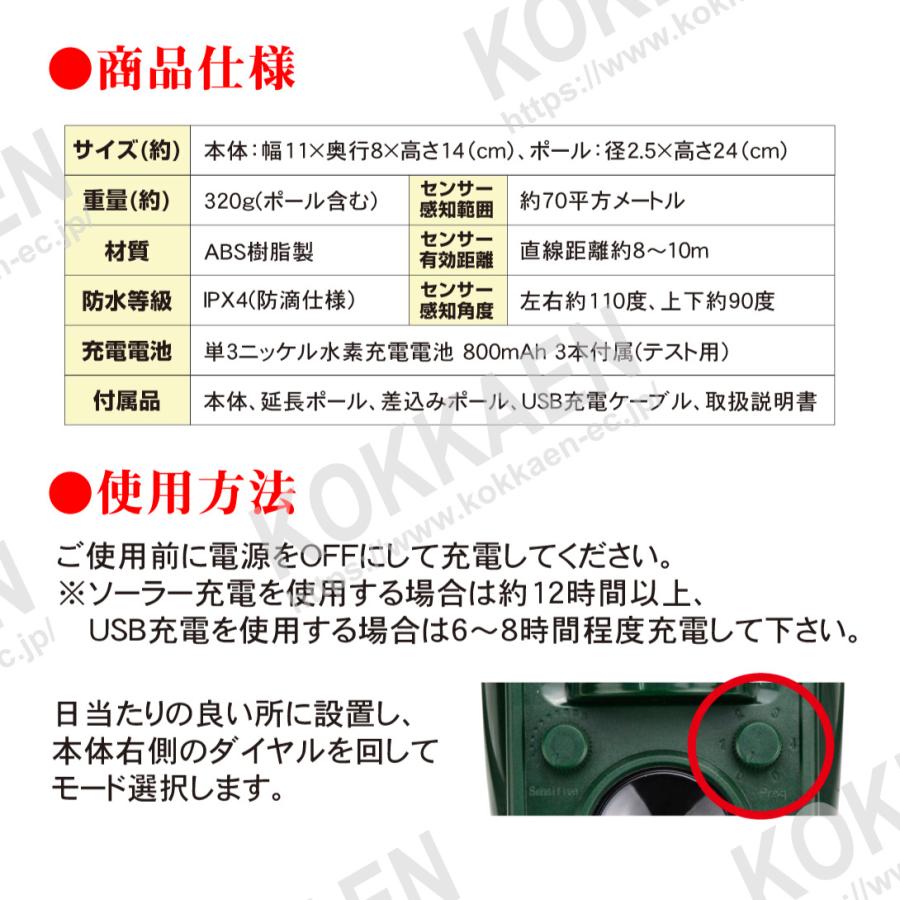 超音波と光とアラーム音で撃退! センサーが上下90度、左右110度、約70m2の範囲、8〜10m先まで感知し、超音波(周波数調節可)・ 光で対象動物を近寄らせなくさせます! ソーラー充電とUSBでの充電も可能。防水等級IPX4の簡易防水機能付なので、どこでも気軽に設置できます。背面に引っ掛け穴があるので吊るして使用することも可能です。