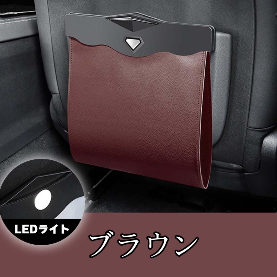 LEDライト付き車用ゴミ箱!引っ掛けるで簡単取り付け!LEDライト付きで暗い車内でも中身が見やすい◎シートバックポケットとして小物入れや収納にも使えます。マグネット付きで開け閉め楽々、コンパクトに収納していただけます。カラーはかわいい4色!【カラー】ブラック、ブラウン、ベージュ、レッド【サイズ】縦約29cm×横約27cm【素材】PUレザー