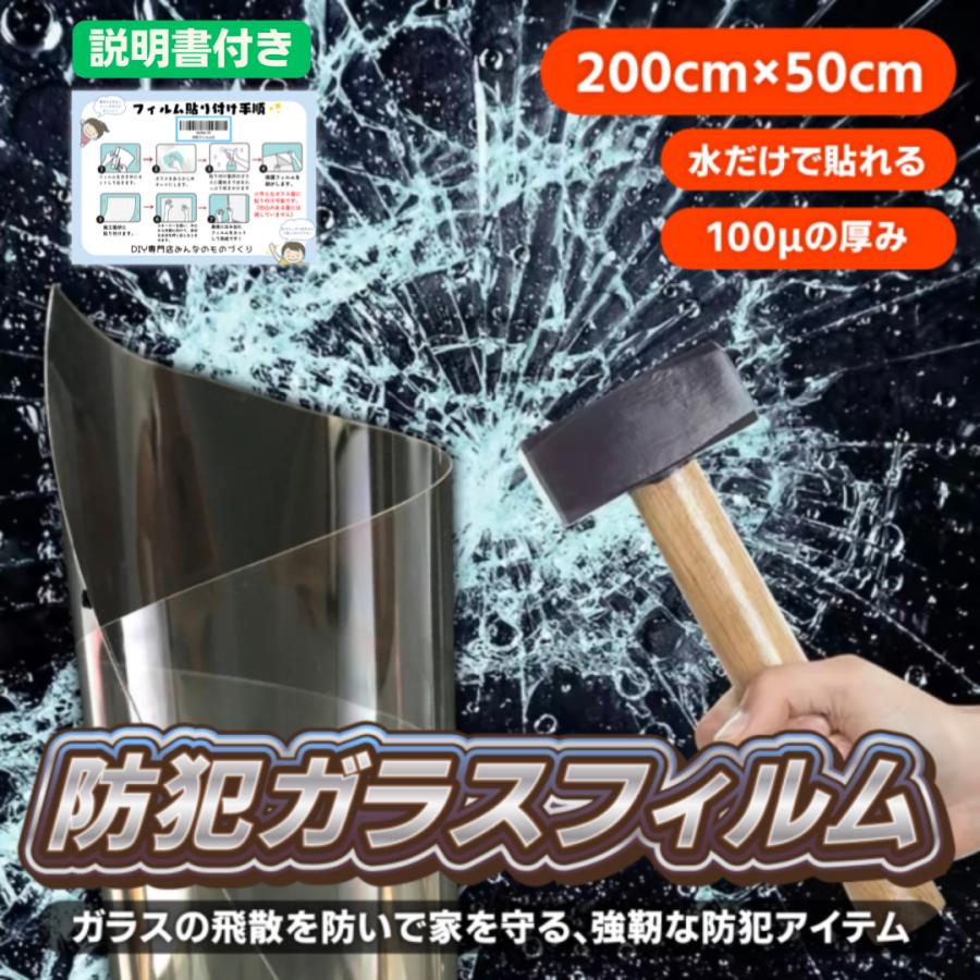 水で簡単に貼れる防犯フィルムを200×50cmの大容量でお届けします。
