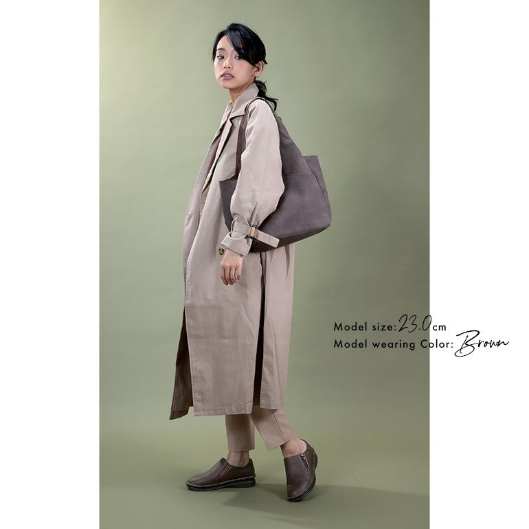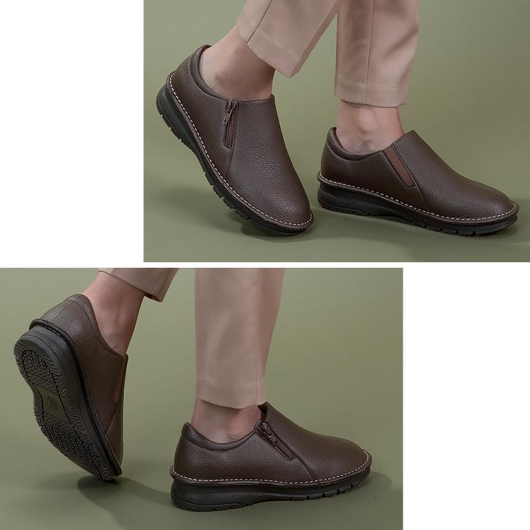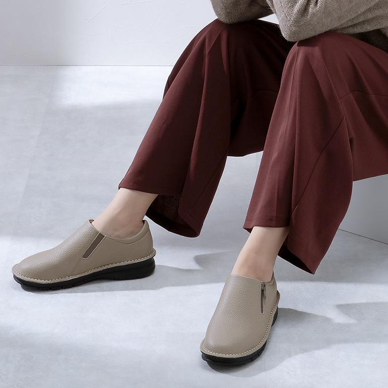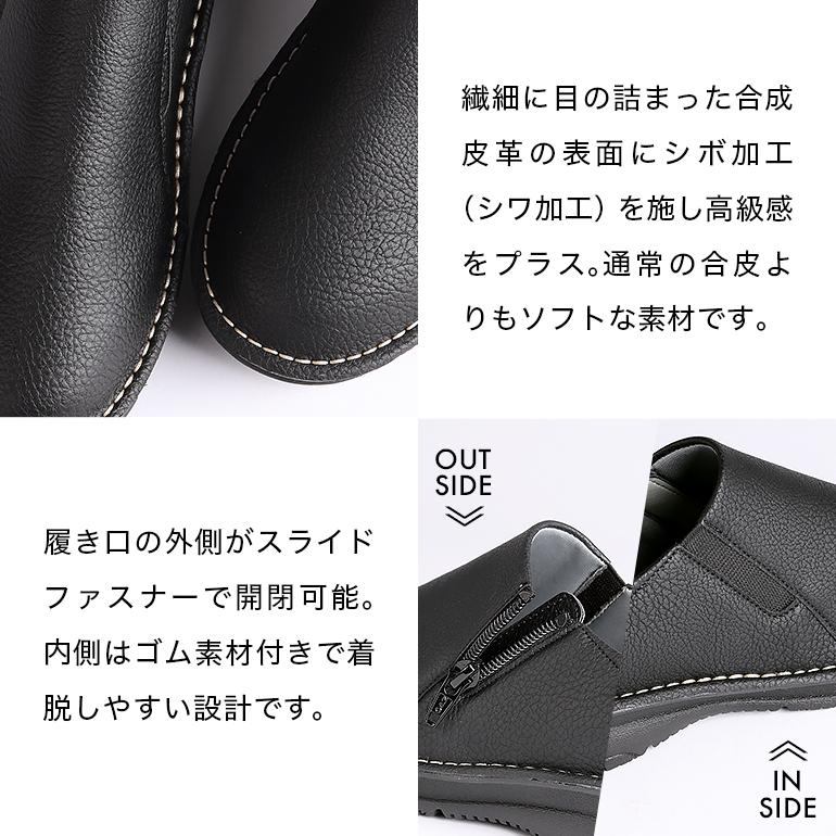 スライドファスナー付きで脱ぎ履きしやすいスリッポンシューズ。高級感のある合皮素材を使用しているので、シンプルながらシックで上品な足元を演出します。