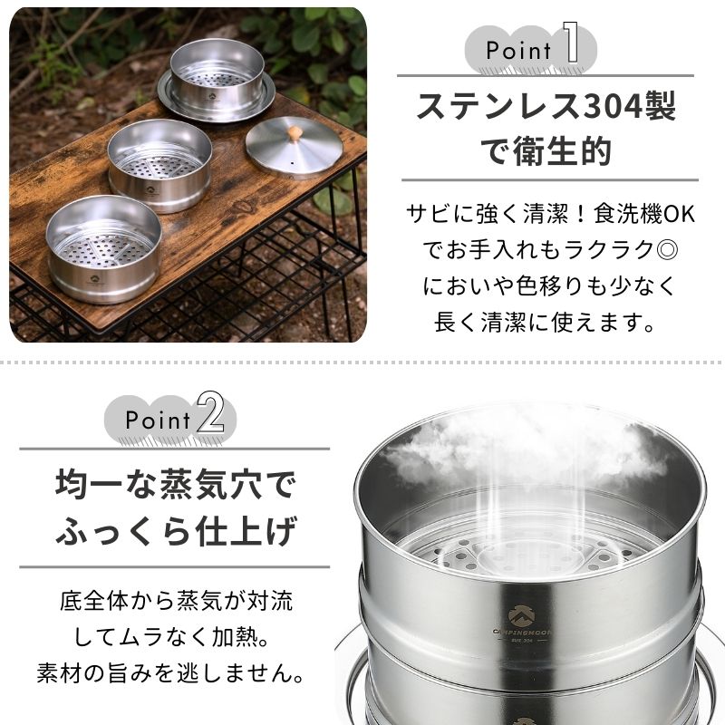 アウトドア用多機能蒸し器です。フィールドクッカーやお鍋にプレートをセットし、その上に食材を入れた中華セイロを乗せるシンプルな構造で、キャンプで本格的な蒸し料理を楽しむことができます。