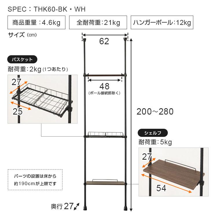 耐荷重:[全体]21kg [伸縮式ハンガーポール]12kg[かご]1つあたり2kg[シェルフ]5kg