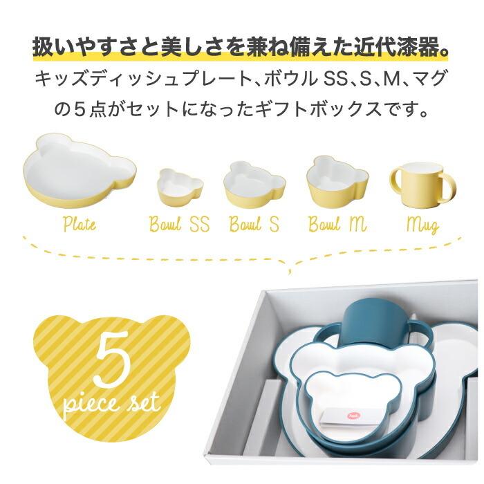 ●「キッズディッシュ ギフトボックス」はキッズディッシュプレート、ボウルSS、S、M、マグ、の5点セットのギフトボックス