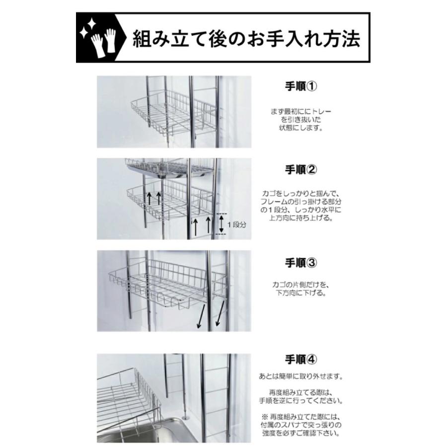 ・キッチンのスペースを有効活用できる、突っ張りタイプの水切りラックです。 作業スペースの確保はもちろん、水切りカゴが目の前にあることで、洗い物作業時の動線がより効率的に。