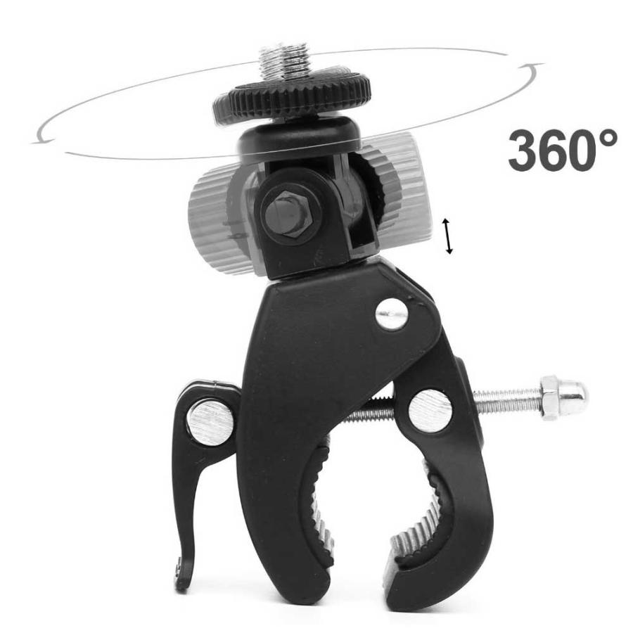 自転車カメラハンドルバークランプマウント カメラ用クランプマウント上の360°回転可能なオートバイハンドルバークリップ 1/4インチネジ 偏向防止 スマホ アクションカメラ デジカメ 一眼レフ モニター マイク LEDライト ケージと互換 バイク スタビライザー 雲台 撮影 送料無料