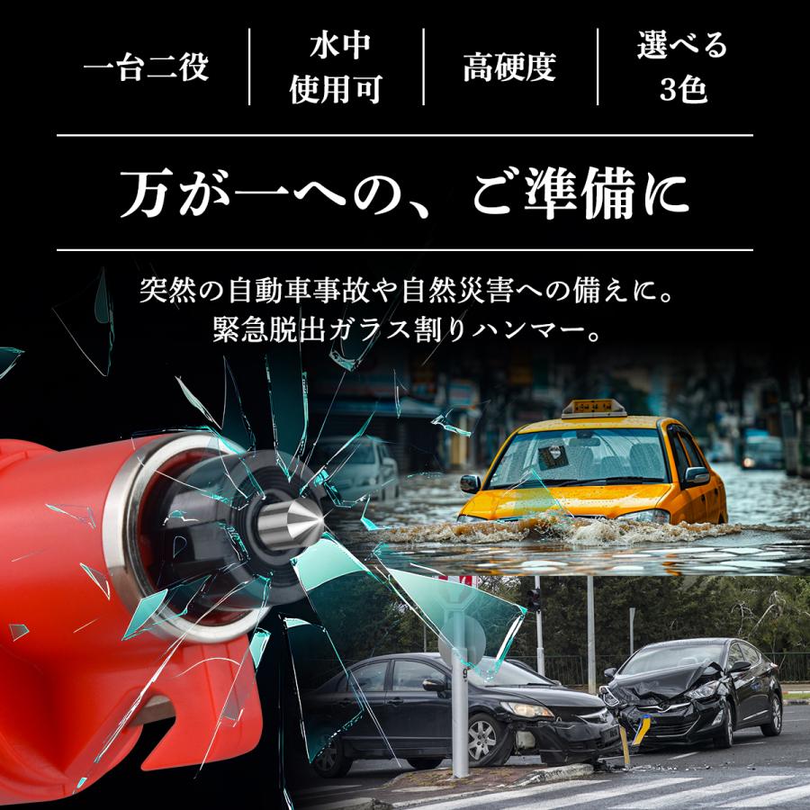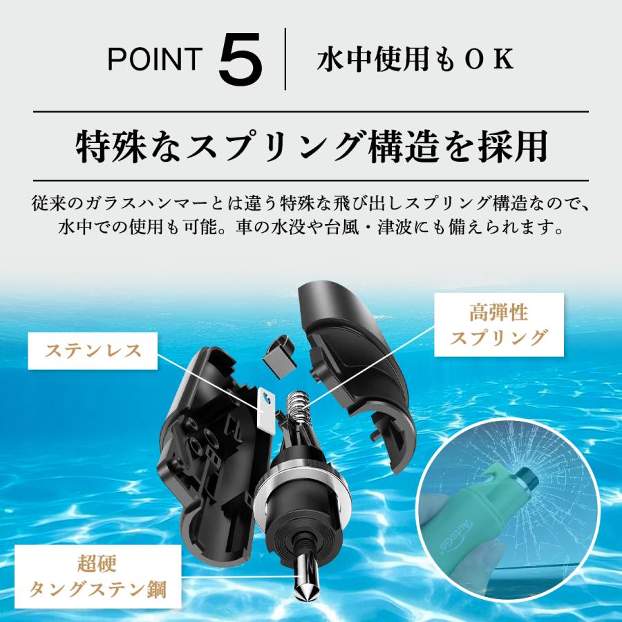 【水中でも適用】毎年、台風や事故など、車で避難しているうちに水位が上昇、水圧によりドアが開かず、車内に閉じ込められてしまった方が多いです。普通の脱出用ハンマーは水没の時に、例えば、川、湖、大きい台風、津波なとの場合に、水圧により使えなくなります。鋭い先端が強力なバネによって押し出される仕組みなので、水中でも使用が可能となっています。あなたの大切な命を守ります!<br>