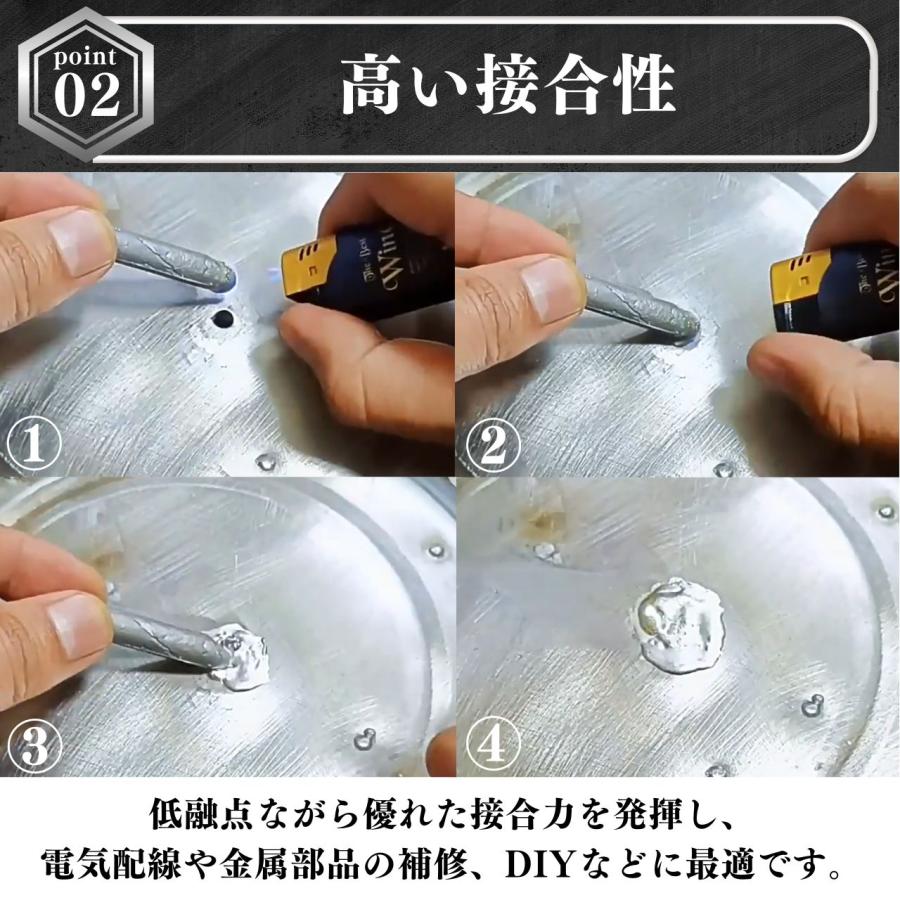 通常のはんだよりも低い温度で溶けるため、ライターで溶かして使用することができます。電気はんだごてが不要なので、持ち運びが簡単で、電源のない環境でも作業が可能です。